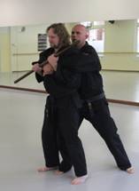 Verdediging: Blokkeren met de Hanbo over beide handen van Uke.