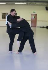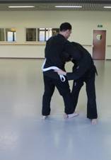 Tori volgt door de klem om het hooft vast te houden en aan te zetten. Pas loslaten nadat Uke opgeeft. Tori komt omhoog en neem op veilige afstand een parate houding aan. Uke komt omhoog nadat Tori de parate houding heeft opgegeven.